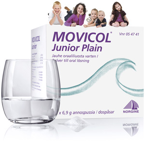 Lääkevalmisteen nimi: MOVICOL ® Junior Plain, jauhe oraaliliuosta varten, 6,9 g annospussi. Käyttöaihe: Ummetuslääke 2-11 -vuotiaiden lasten pitkäaikaisen ummetuksen hoitoon. MOVICOL ® Junior Plain –valmistetta käytetään myös lääkäriin määräyksestä erittäin vaikean ummetuksen (ulostetukkeuman) hoitoon 5-11 -vuotiaille lapsille. Pakkauskoko: 30 annospussia. Markkinoija: Sabora Pharma Oy, Suomi